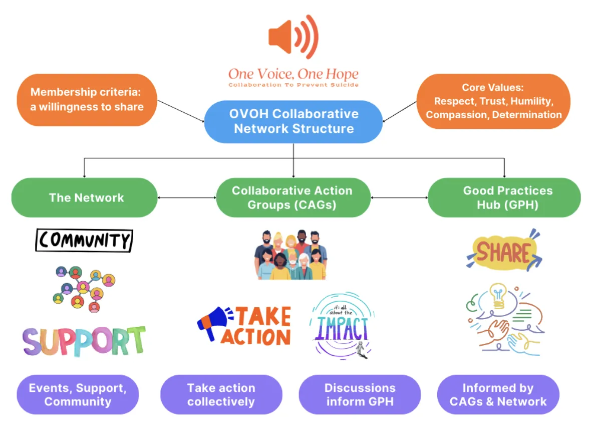 One Voice, One Hope (OVOH) is a Collaborative Action Network (CAN) of people and organisations who share a commitment to preventing all preventable suicides across the 4 nations of the UK.
